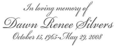 On the morning of May 29, 2008, the world lost a very special person. Dawn Renee Silvers was struck and killed by an automobile while jogging on Sugarloaf Key, Florida. Dawn was training for an upcoming marathon.This site is dedicated to the life and memory of Dawn Renee Silvers. Dawn leaves behind her friend and fiance, Roy Payne, as well as her loving family, and extended families including the Payne family, Joe and Meri-Lynn Britz, the Vineyard Community Church, and Bill